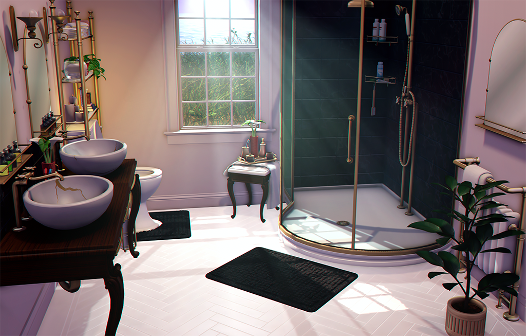 • Vanity, Shower, Rugs, Toilet, Plant, Radiator, Tray, Stool, Shelves, Mirror & Tissue Holder